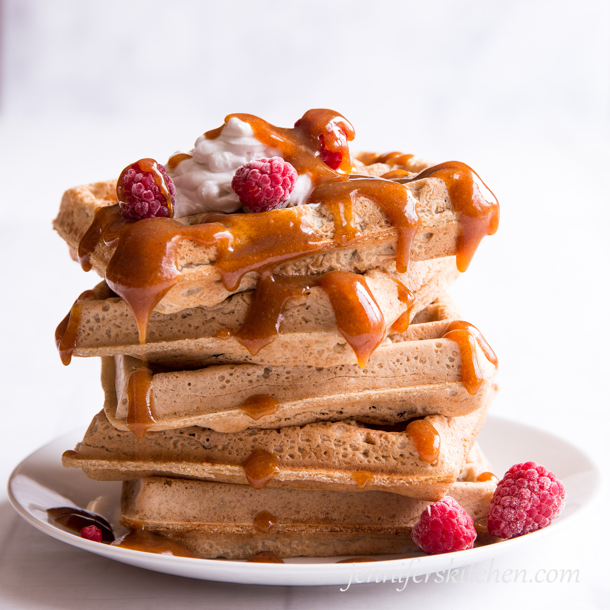 Healthy waffles need a really hot iron to bake properly. I recommend this small, round waffle iron. It’s not a Belgian iron, but it gets nice and hot and bakes beautiful waffles. (And, to be honest, I like the waffles that come out of it better than the ones from my Belgian iron.)